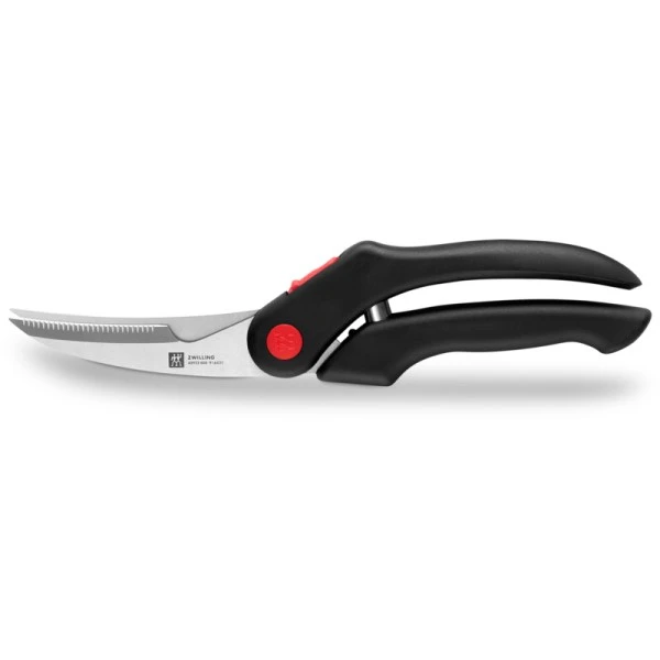 Kvalitets Zwilling Fjerkræsaks: Saksen har takker på skæret som griber fat i skindet når man klipper, derfor er fjerkræsaksen nem at klippe med. Den har også et “hak” på skæret som holder fast når man skal klippe benene eller lårene over. Håndtaget er skridsikker og har en lås så saksen er lukket når den opbevares i skuffen.