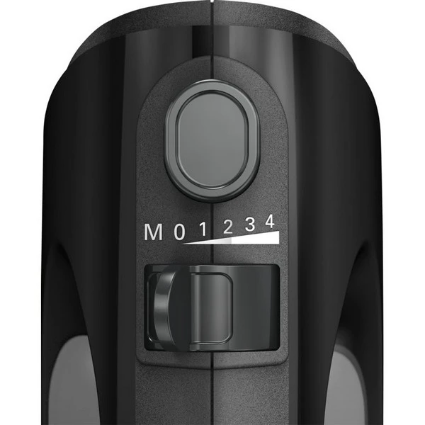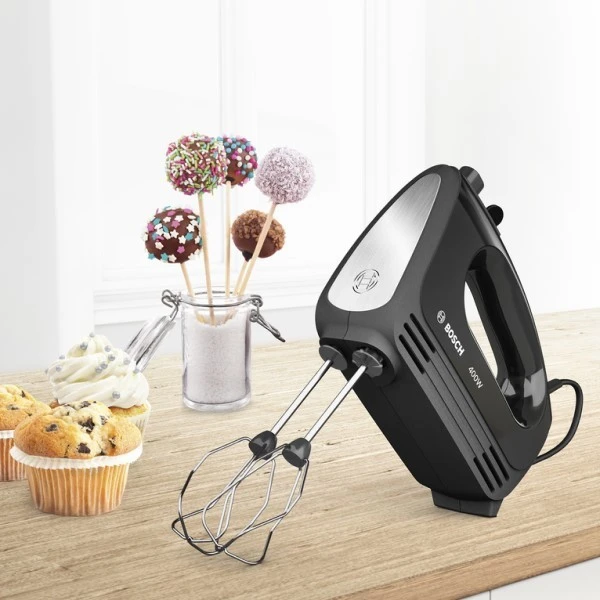 Sort Bosch clevermixx håndmixer på 400 watt med 2 piskeris og 2 dejkroge, kraftig håndmixer med 5 hastighedsindstillinger og momentknap. Når man benytter momentknappen kører håndmixeren på højeste hastighed, men kun når knappen holdes inde. Dette er ret smart hvis man for eksempel pisker fløde og kun lige mangler “lidt” inden fløden bliver til smør.