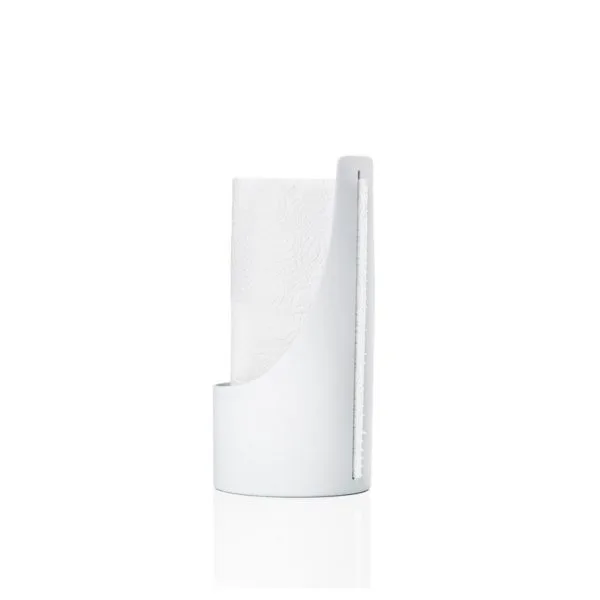 Zone køkkenrulleholder til bord i hvid. Thomas Dudzinski har designet køkkenrulleholderen på en praktisk og innovativ måde. Holderen har en slids, som holder køkkenrullen på plads og en god solid bund, som holder holderen stabil på bordet. Derudover har den uundværlige køkkenrulleholder et elegant design. Køkkenrulleholderen passer til de fleste størrelser køkkenrulle – Maks. diameter 11 cm. Maks højde 23 cm.