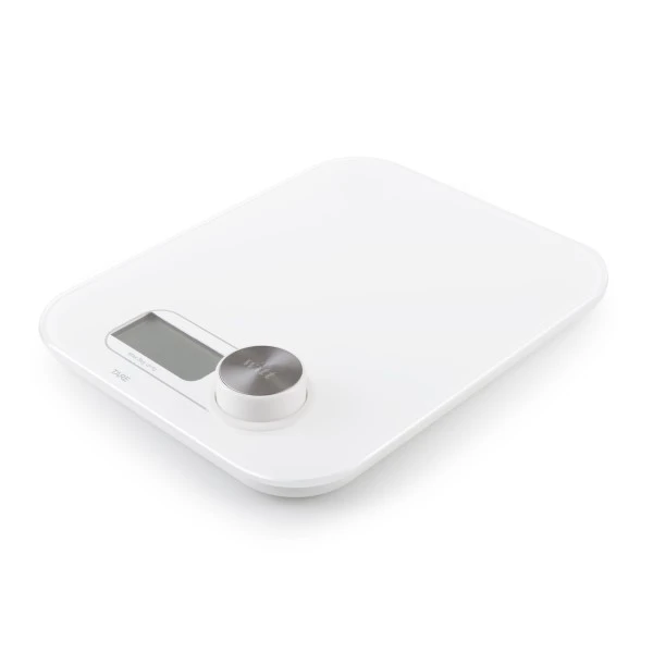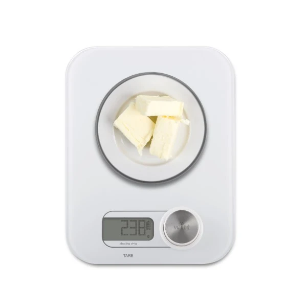 Den stilrene køkkenvægt hvid fra Witt er et batterifrit produkt.