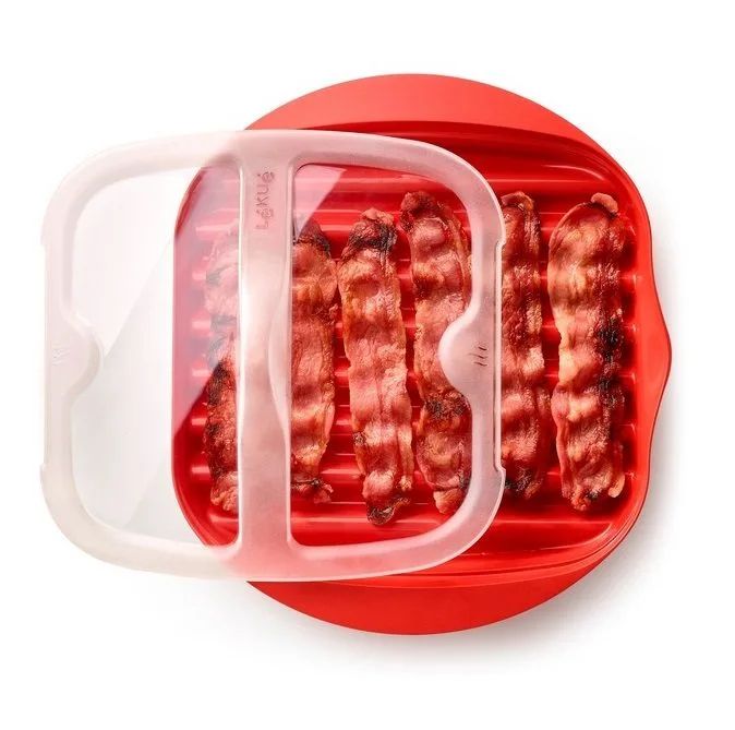 Rigtig smart bacon steger til mikroovnen, som sikrer dig sprødt bacon på under 5 minutter! Formen måler 28 x 25 cm, så der er plads til at stege en hel pakke bacon ad gangen. Med denne smarte bacon steger undgår man, at hele mikroovnen bliver svinet til i fedt, når man steger bacon i mikroovnen.