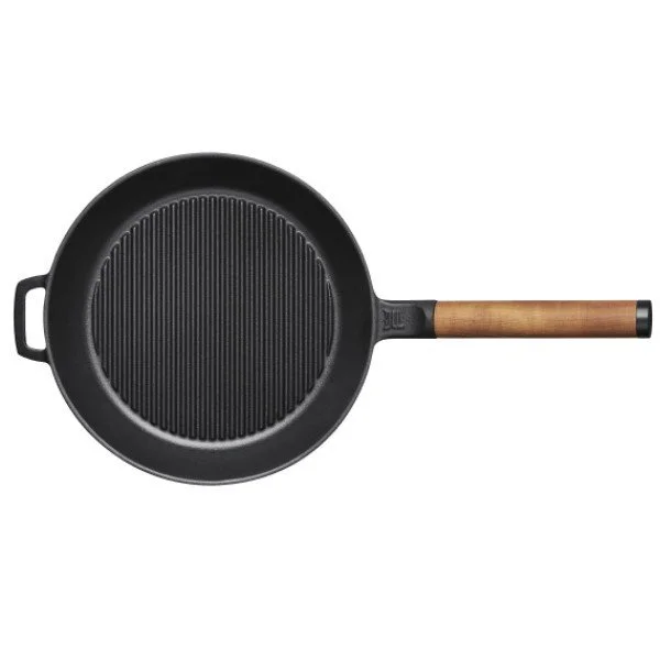 Grillpanden er rund og har en diameter på 26 cm. Panden med et aftageligt træhåndtag lavet i birketræ. Da panden er lavet i støbejern, kan du også bruge den i ovnen, på max 240 grader. Men hvis det er noget du tænker at gøre, så skal du skrue træhåndtaget af, inden du placere panden i ovnen. Træet kan nemlig ikke tåle den høje varme 🙂