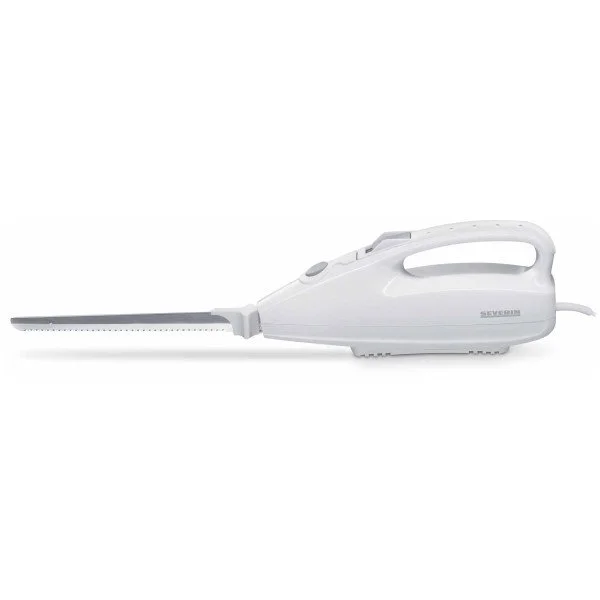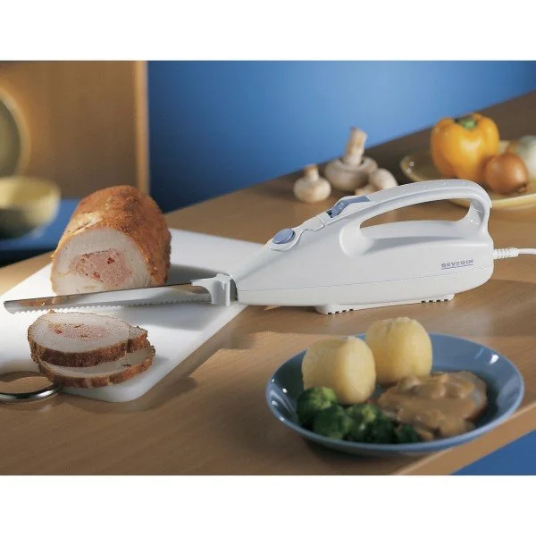 Elektrisk kniv fra tyske Severin. Denne smarte og effektive elektriske kniv er yderst effektiv i køkkenet og klarer de fleste skæreopgaver. Fordelen ved denne elektriske kniv er at de 2 savtakkede klinger kører så hurtigt, at man ikke flosser kødet.