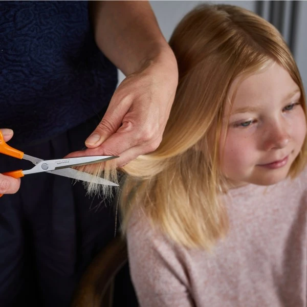 God Frisørsaks fra Fiskars. Klingerne på saksen har ru overflade så håret ikke “skrider” når man klipper og håndtaget har fingerstøtte.
